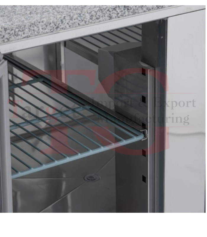 - سطح عمل من الجرانيت: الجزء العلوي من المنضدة مصنوع من الجرانيت الصلب، وهو مادة مثالية لتحضير عجينة البيتزا حيث يبقى باردًا ويسهل تنظيفه.