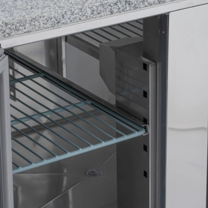 • سطح عمل من الجرانيت: الجزء العلوي من المنضدة مصنوع من الجرانيت الصلب، وهو مادة مثالية لتحضير عجينة البيتزا حيث يبقى باردًا ويسهل تنظيفه.