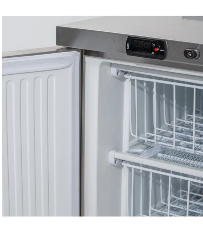This unit is a practical and space-saving solution, combining the functionality of a work counter with a large freezer, designed to fit seamlessly under a counter.