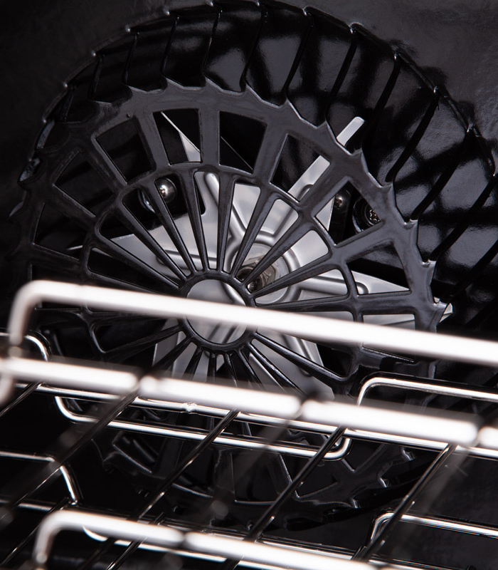 Featuring a robust stainless steel frame and a compact countertop design, it utilizes a powerful fan-assisted system that ensures even cooking from all sides.